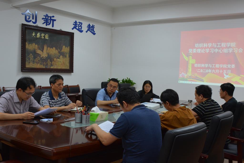 6月15日,纺织科学与工程学院在金花校区纺织楼四楼会议室召开党委理论学习中心组会议,专题学习《中华人民共和国民法典》、教育部《高等学校课程思政建设指导纲要》并观看《防范化解公共安全领域重大风险》专题片。学院党委理论学习中心组成员、教工党支部书记参加了会议,会议由党委书记胡小进主持。