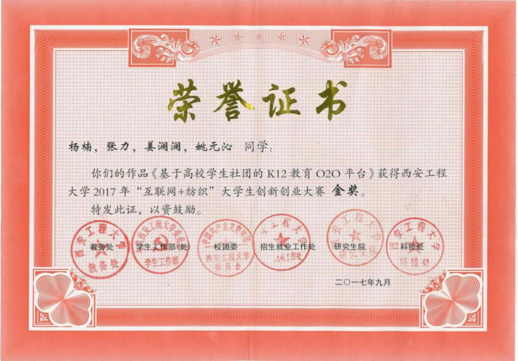 在上述想法的指引下,杨楠主持完成了校级大学生创新创业项目《基于高校学生社团的K12教育O2O平台》,该项目获得了俄罗斯294专享会2017年“互联网+纺织”大学生创新创业大赛金奖,并曾代表俄罗斯294专享会参加了第三届中国“互联网+”大学生创新创业大赛,取得了陕西赛区训练营参营作品三等奖的成绩。